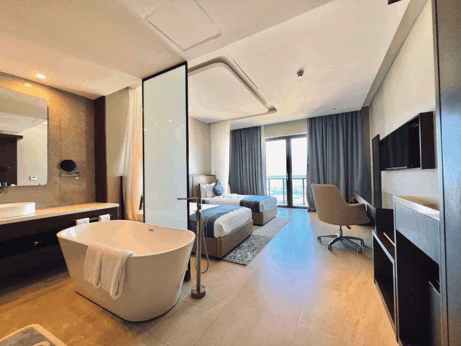 Luxurious suite offering generous space, thoughtfully designed for 2 adults with 1 extra bed, combining elegance, comfort, and refined relaxation. Featuring stylish interiors, plush bedding, and modern amenities, the suite provides a serene retreat ideal for couples or small families seeking privacy and indulgence. Whether relaxing indoors or unwinding after a day by the beach, this suite delivers a perfect balance of sophistication, space, and comfort.